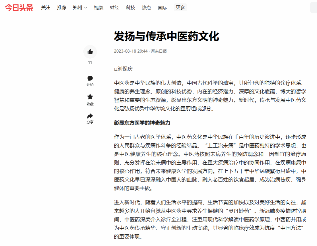 中医药文化的传承,必须围绕学术研究、科学阐释、宣教普及、古籍保护、传承创新、传播交流、政策保障等方面多管齐下,续写妙手回春的当代传奇。