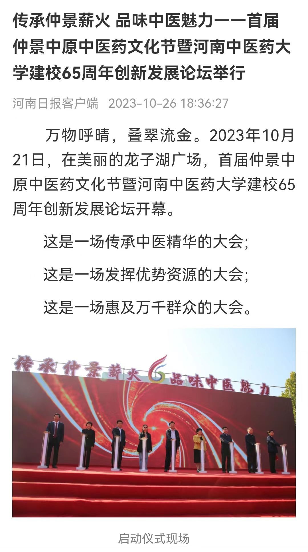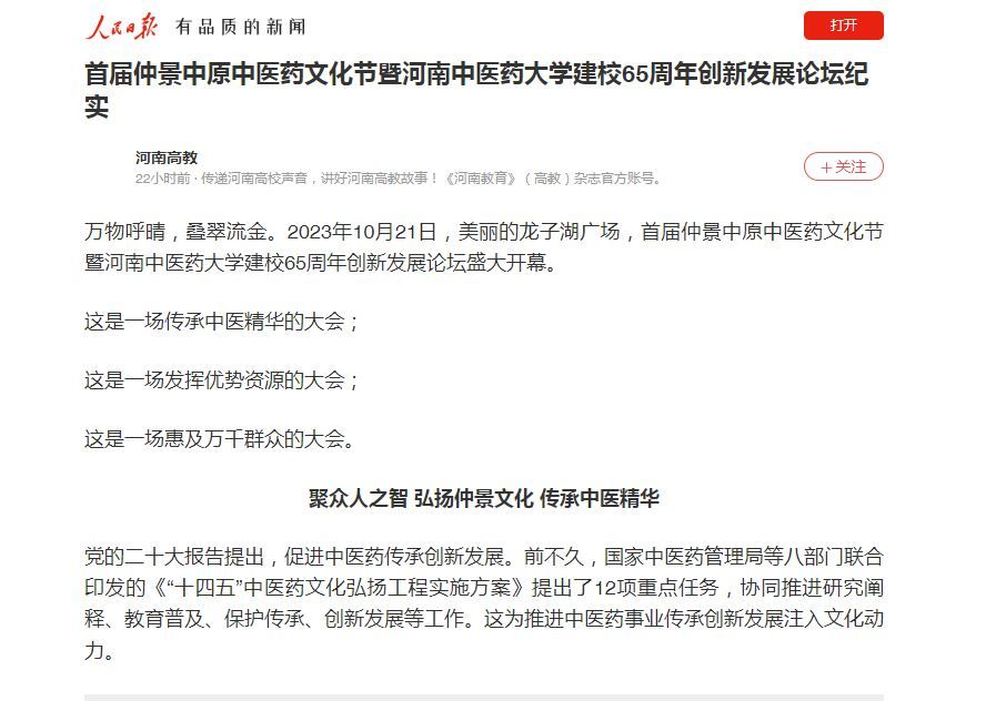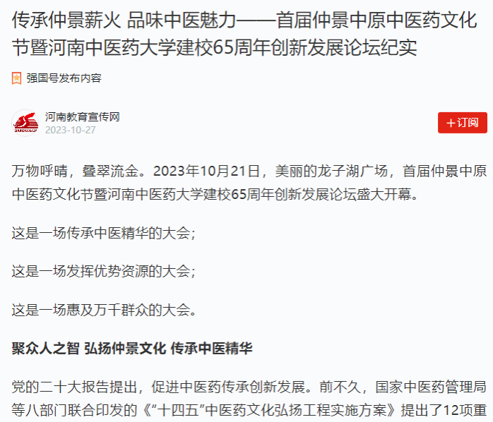 河南日报、学习强国丨首届仲景中原中医药文化节暨leyu·乐鱼(中国)体育官方网站建校65周年创新发展论坛纪实