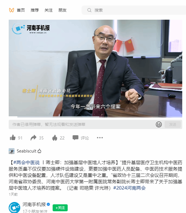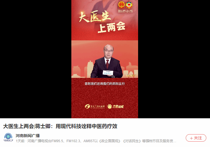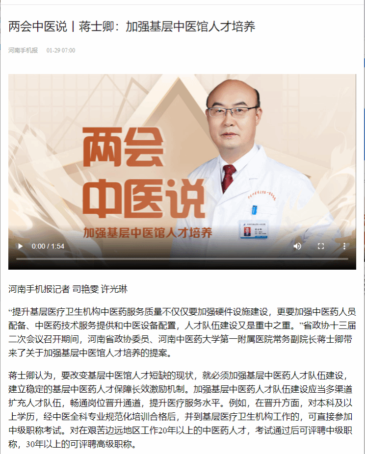 央广网、河南手机报等丨蒋士卿:加强基层中医馆人才培养