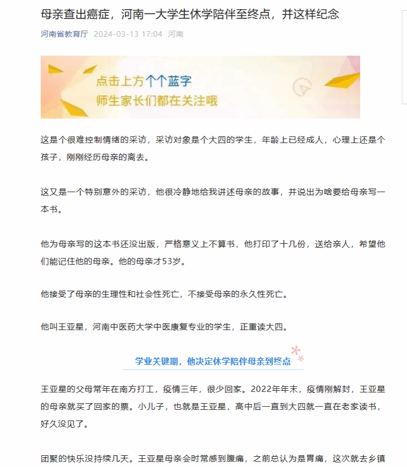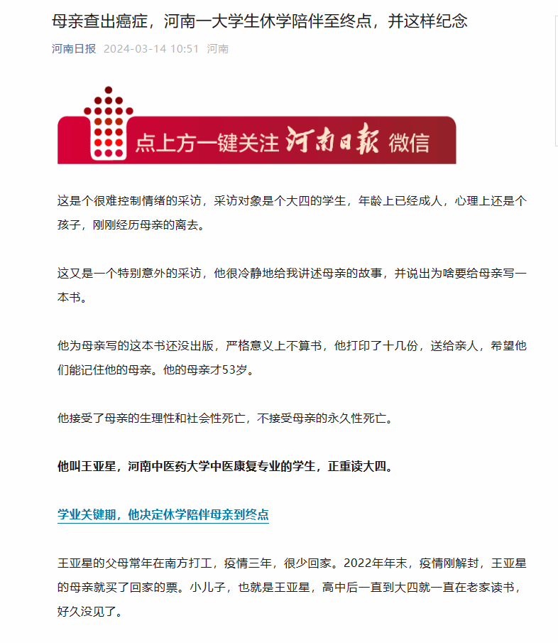王亚星说,我知道休学意味着什么,休学意味着放弃趁热打铁一鼓作气的气力,放弃圈子,放弃时间和自由,但是我愿意,跟妈妈比起来,这些都不重要。