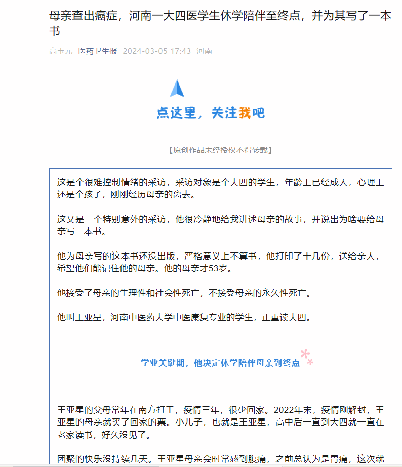 又三个月,母亲病逝。王亚星把这三万字打印了十几份送给亲人。
