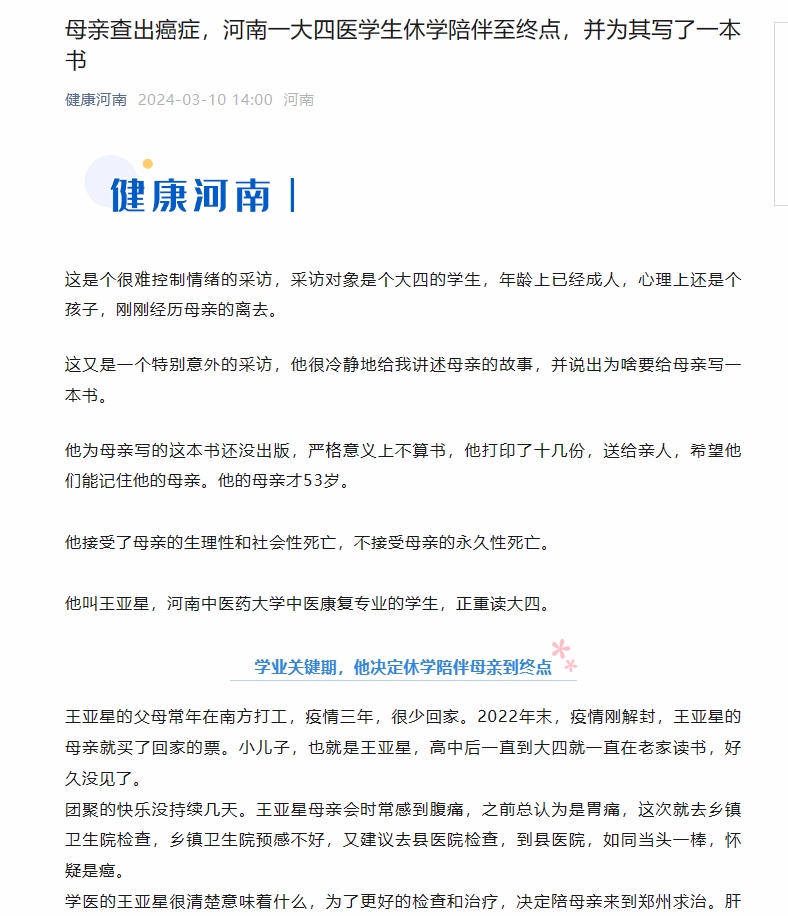 医学生一般要考研,大四是关键期,本来已经进入备战状态的王亚星在新学期开学两个星期后,还是买车票到广州,陪母亲看病,并决定休学。