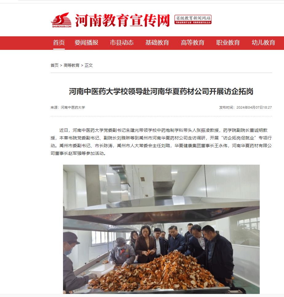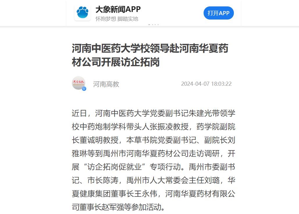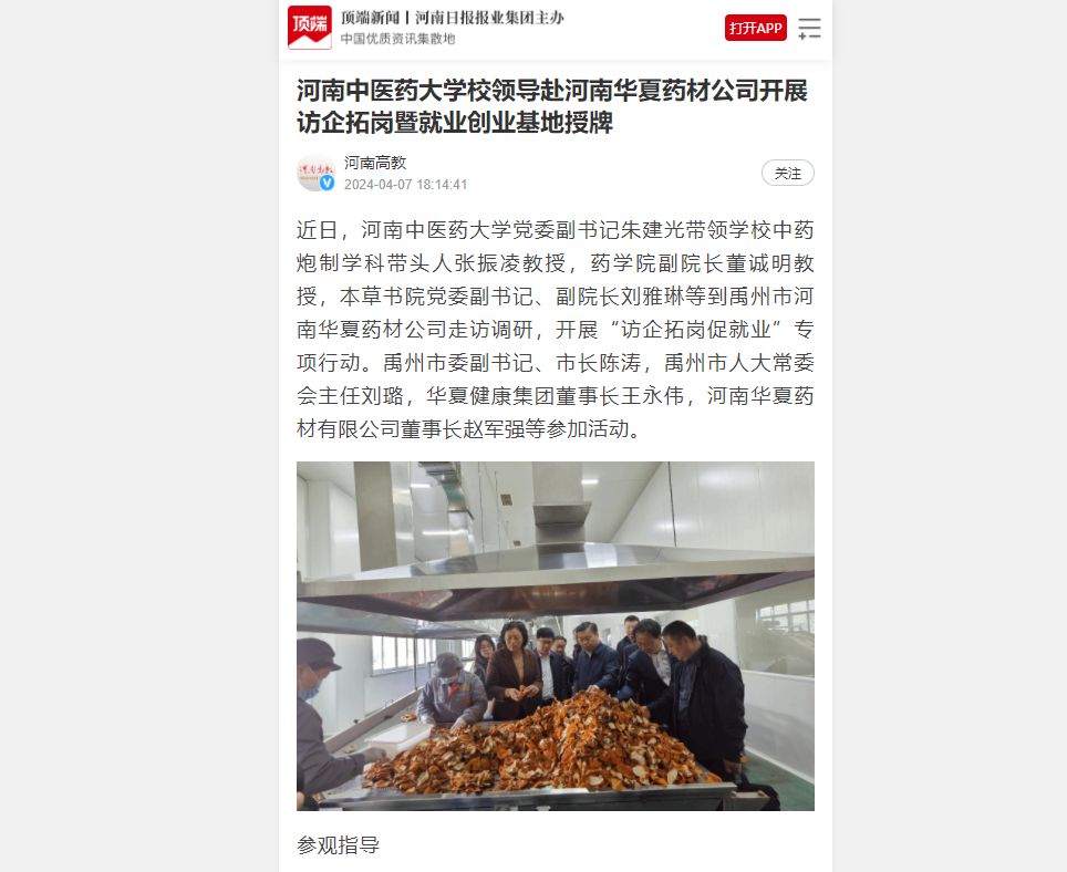 河南教育宣传网等丨leyu·乐鱼(中国)体育官方网站校领导赴河南华夏药材公司开展访企拓岗暨就业创业基地授牌