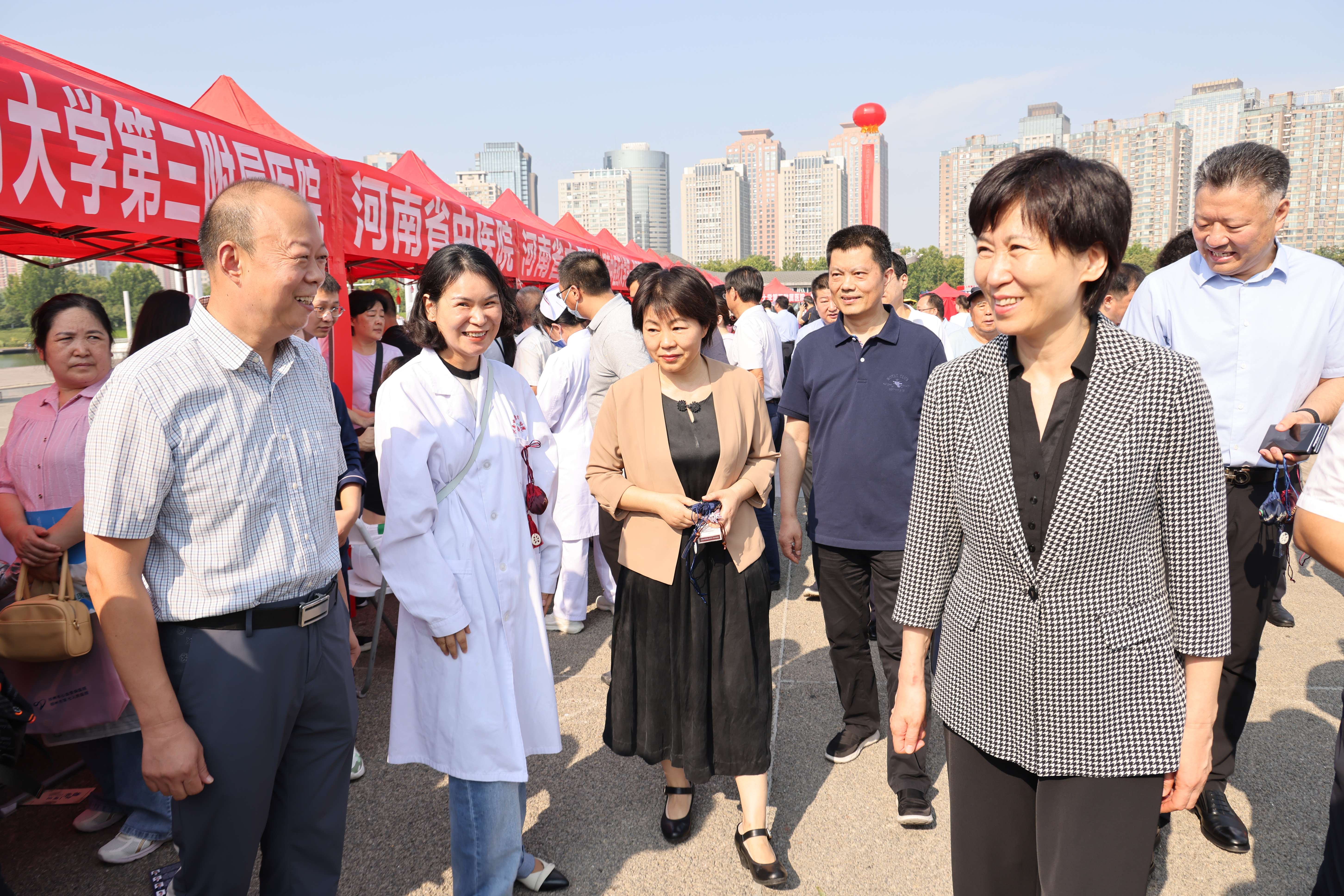 河南省卫生健康委员会党组副书记、副主任侯红在郑东新区如意湖义诊活动现场慰问三附院参加义诊的专家们