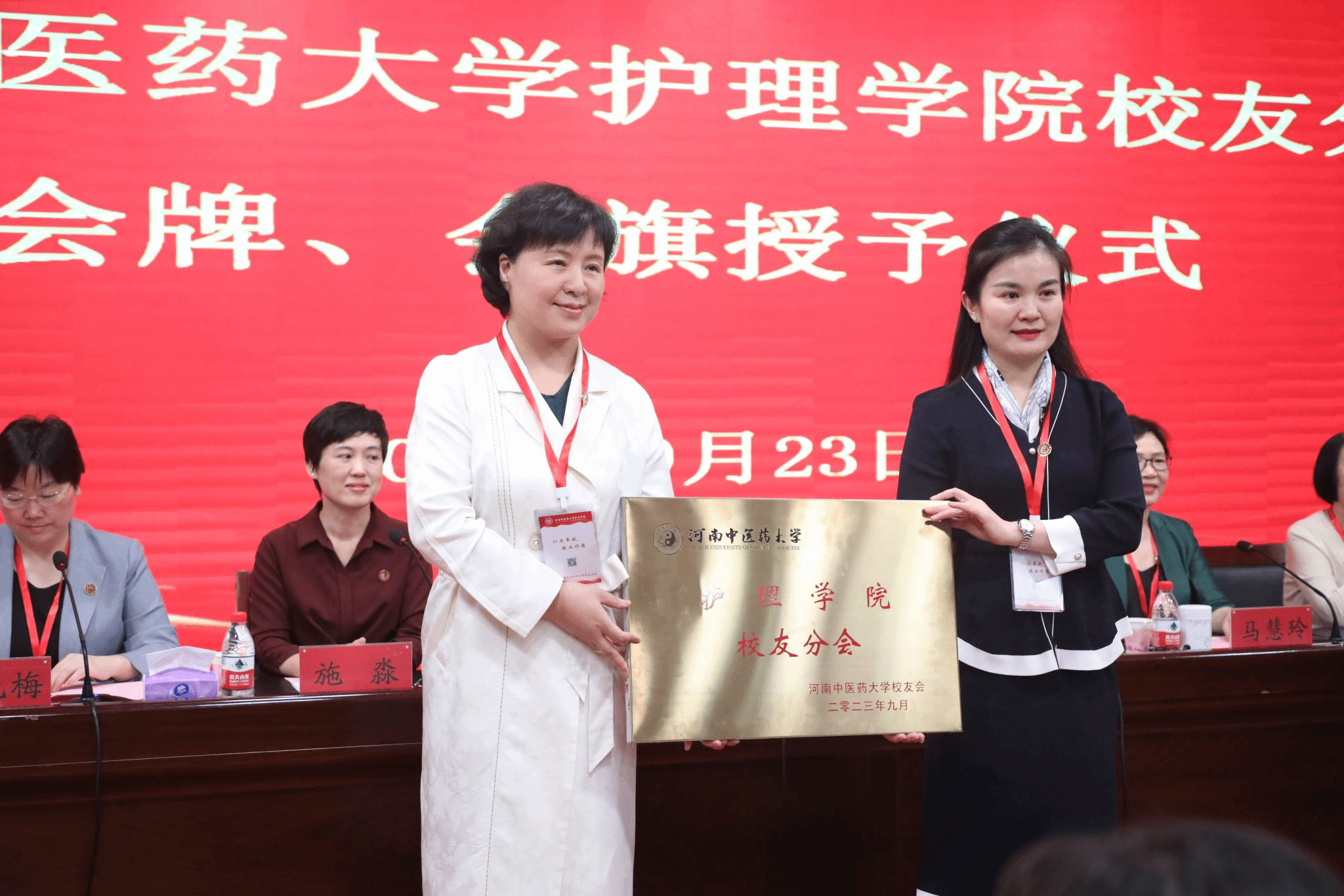 在热烈的掌声中,田力向护理学院校友分会首任会长曹珊授会牌、会旗;施淼、曹珊分别为第一届理事会成员代表颁发了聘书。