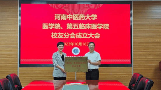 在热烈的掌声中,施淼向医学院、第五临床医学院校友分会首任会长高剑峰授会牌、会旗,并为第一届理事会成员代表颁发聘书。