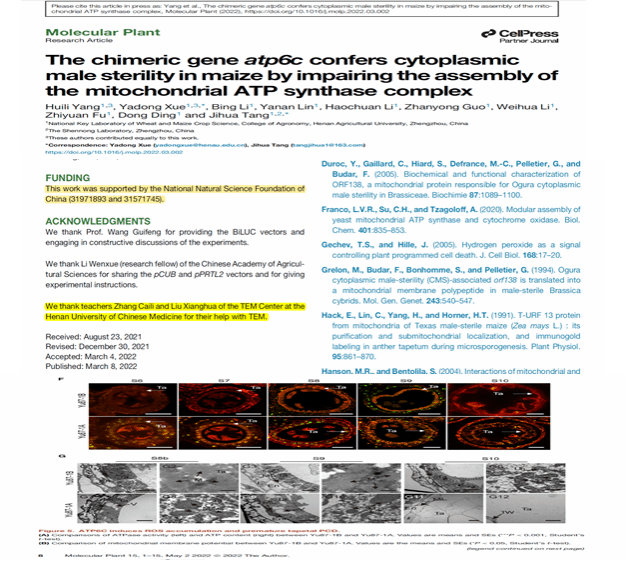 随着电镜技术的不断精湛,每年慕名而来电镜中心预约的校外用户数量也在逐年攀升。其中,河南农业大学杨慧丽课题组在《Molecular Plant》(《分子植物》,JCR1区, IF:21.949)撰文《The chimeric gene atp6c confers cytoplasmic male sterility in maize by impairing the assembly of the mitochondrial ATP synthase complex》 (《嵌合基因atp6c通过破坏线粒体ATP合酶复合体的组装,赋予玉米细胞质雄性不育性》),该文章作者委托电镜中心对其研究中透射电镜制样、拍照和数据分析进行了相关工作,并在论文中明确致谢。类似的优质服务案例不胜枚举。